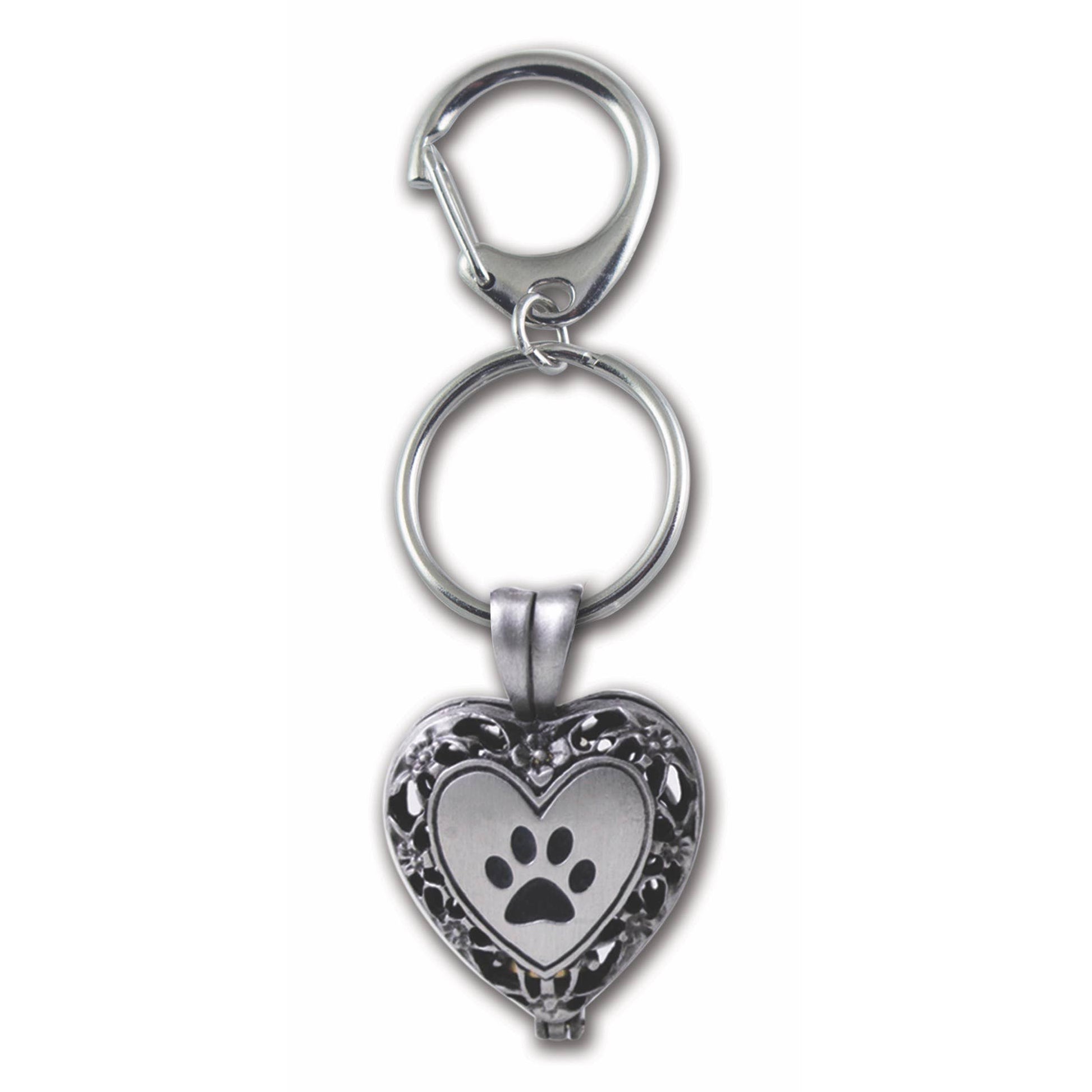 Silver enamel finished metal paw print locket key chain. Holds vial for ashes of a lost pet.