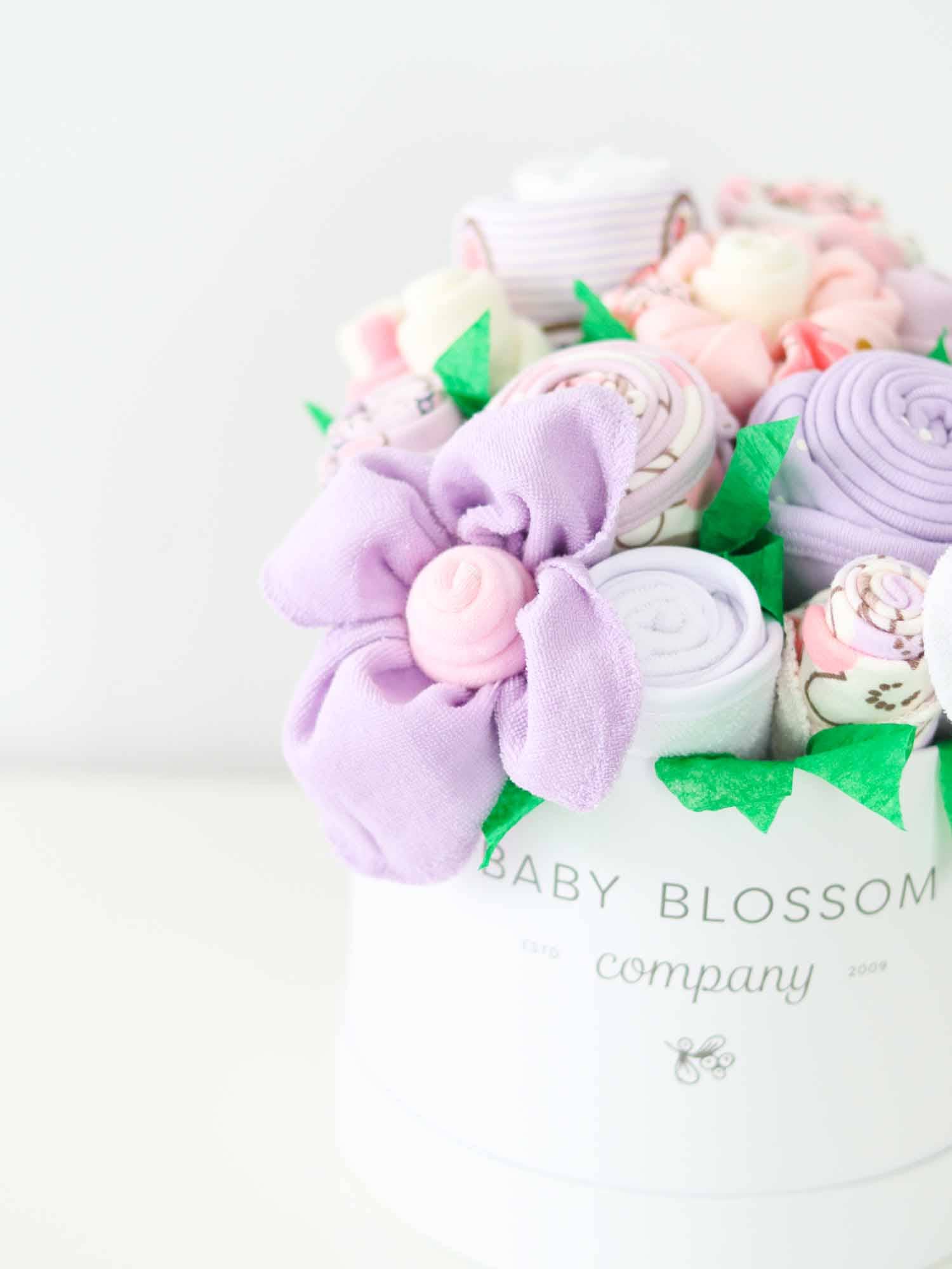 PETITE: 1 bodysuit 1 bib 1 burp cloth 3 washcloths 3 pairs of socks Clothing is size 0-3 months. Bouquets are handcrafted, so please allow for slight variations in size and shape. Bouquet comes wrapped in cellophane and tied with a coordinating bow. Gift tag is included with space for a gift message and content details on the back.