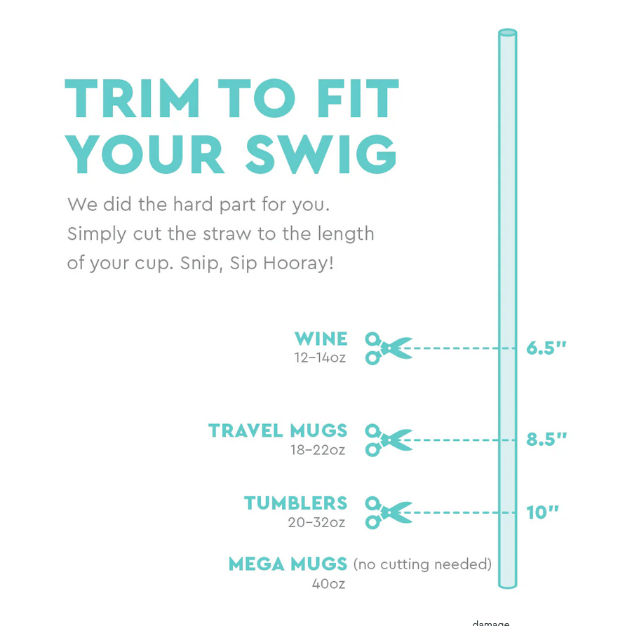 Compatible with all Swig tumblers and fits most other standard drinkware brands. Straws can be cut to size using the diagram featured on the back of the packaging. Pull gently when removing the protective cap to avoid damage.