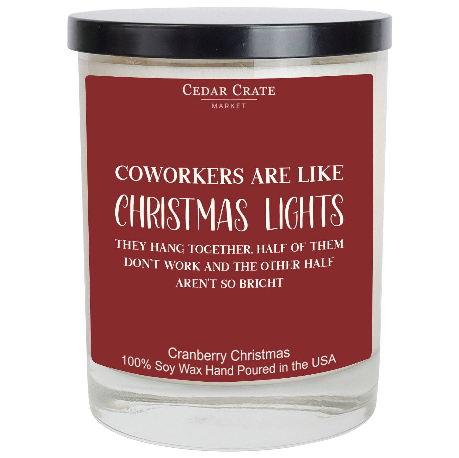 Coworkers Are Like Christmas Lights. They Hang Together, Half Of Them Don't Work And The Other Half Aren't So Bright SCENT: #16 Cranberry Christmas. Fresh and fragrant cranberry are combined with notes of green grass, citrus, violet, musk, and sandalwood for an invigorating scent. CANDLE INFO: Size: 13.5 oz Jar | 3.5 x 3.5 x 4"" 60+ Hours 100% Soy Wax, Essential and Premium Fragrance Oils, Cotton Wick, Reusable Jar. Phthalate Free, Non-Toxic, Cruelty Free, Vegan, Non-GMO. Hand Poured in Minnetonka, MN, Made in USA