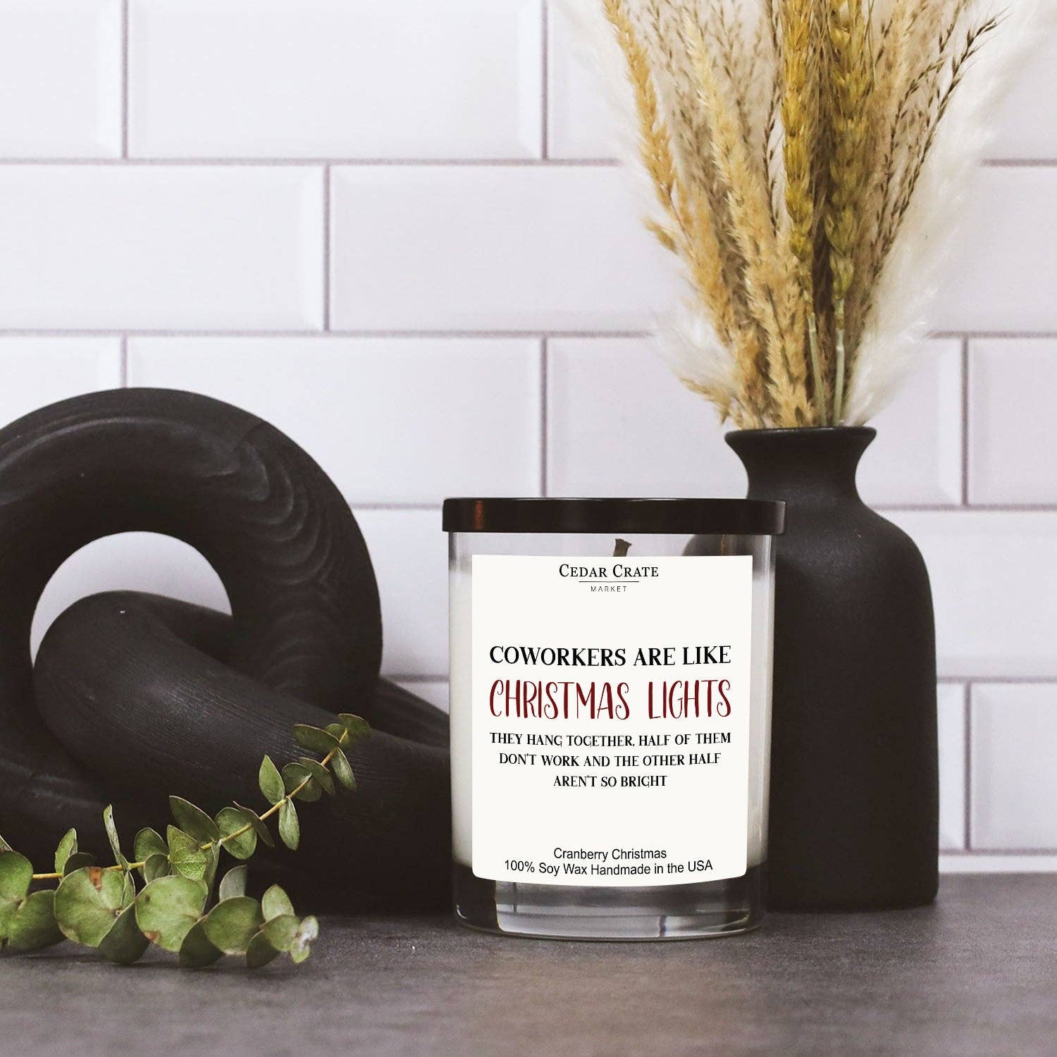 Coworkers Are Like Christmas Lights. They Hang Together, Half Of Them Don't Work And The Other Half Aren't So Bright SCENT: #16 Cranberry Christmas. Fresh and fragrant cranberry are combined with notes of green grass, citrus, violet, musk, and sandalwood for an invigorating scent. CANDLE INFO: Size: 13.5 oz Jar | 3.5 x 3.5 x 4"" 60+ Hours 100% Soy Wax, Essential and Premium Fragrance Oils, Cotton Wick, Reusable Jar. Phthalate Free, Non-Toxic, Cruelty Free, Vegan, Non-GMO. Hand Poured in Minnetonka, MN, Made in USA