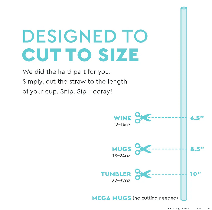 Compatible with all Swig tumblers and fits most other standard drinkware brands. Straws can be cut to size using the diagram featured on the back of the packaging. Pull gently when removing the protective cap to avoid damage.