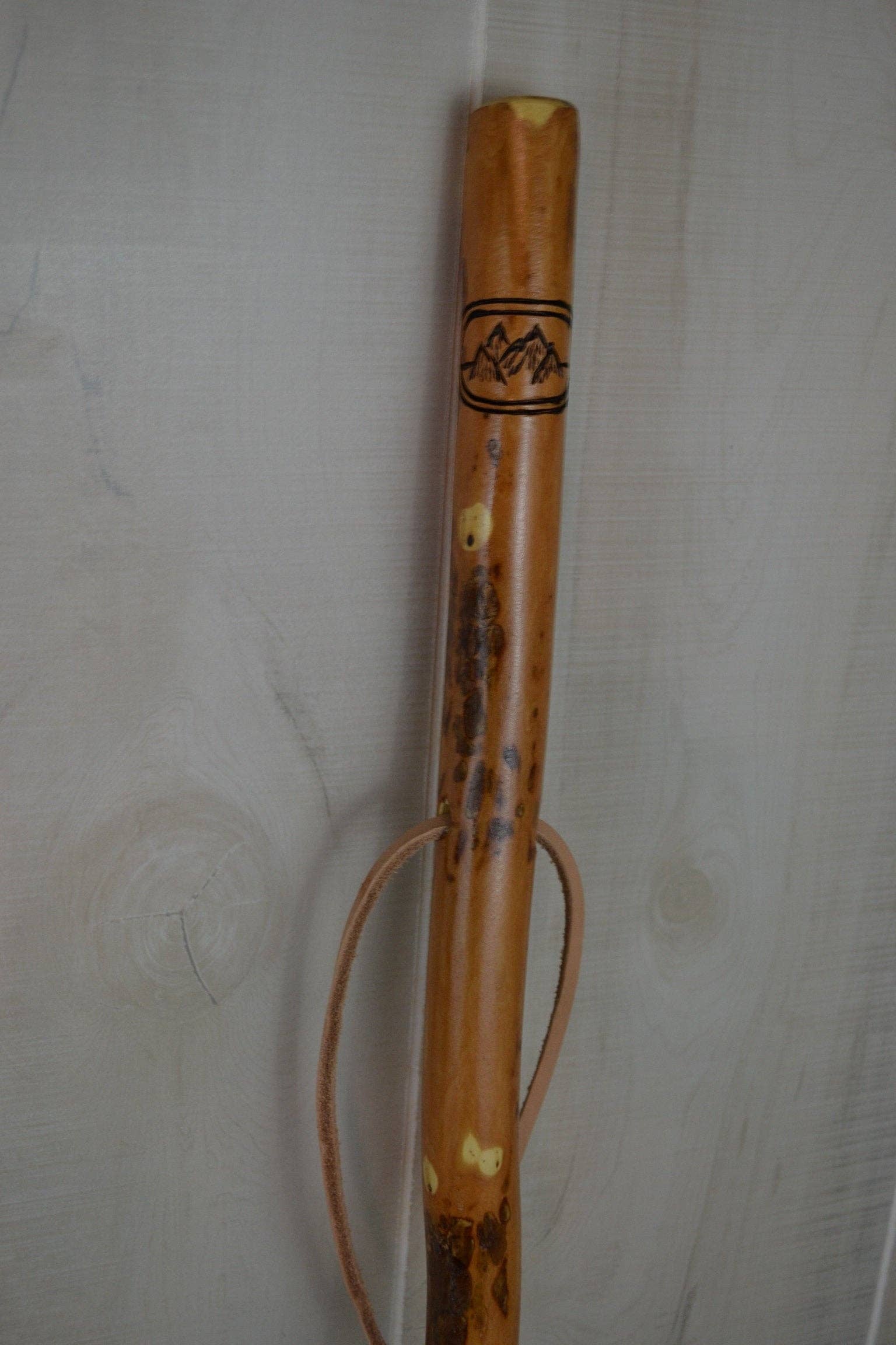 Mountain range carving on walking stick, staff, natural hiking stick.