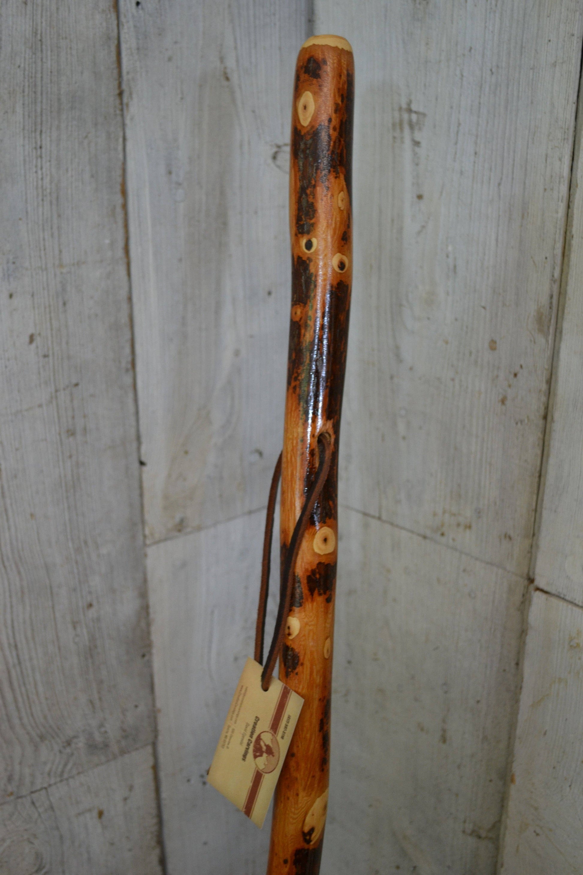 This classic hardwood is perfect for its strength and beauty. Measuring up to 60" tall makes this great for hiking up and down hills while giving the added support necessary. This walking stick comes with a leather strap to support your wrist while exploring and a rubber tip to give a little extra grip at the base of the staff. Having been kiln-dried for months, then sanded and finished, this hiking stick will last a lifetime of use. Wood types used are woods grown from the Ozarks such as hickory, elm, oak, dogwood, hawthorn, persimmon, and others. Made in the USA! Strong * Leather strap * Heavy-duty rubber stopper * Carved down handle * Priority mailing * Carefully packaged and insured on delivery.