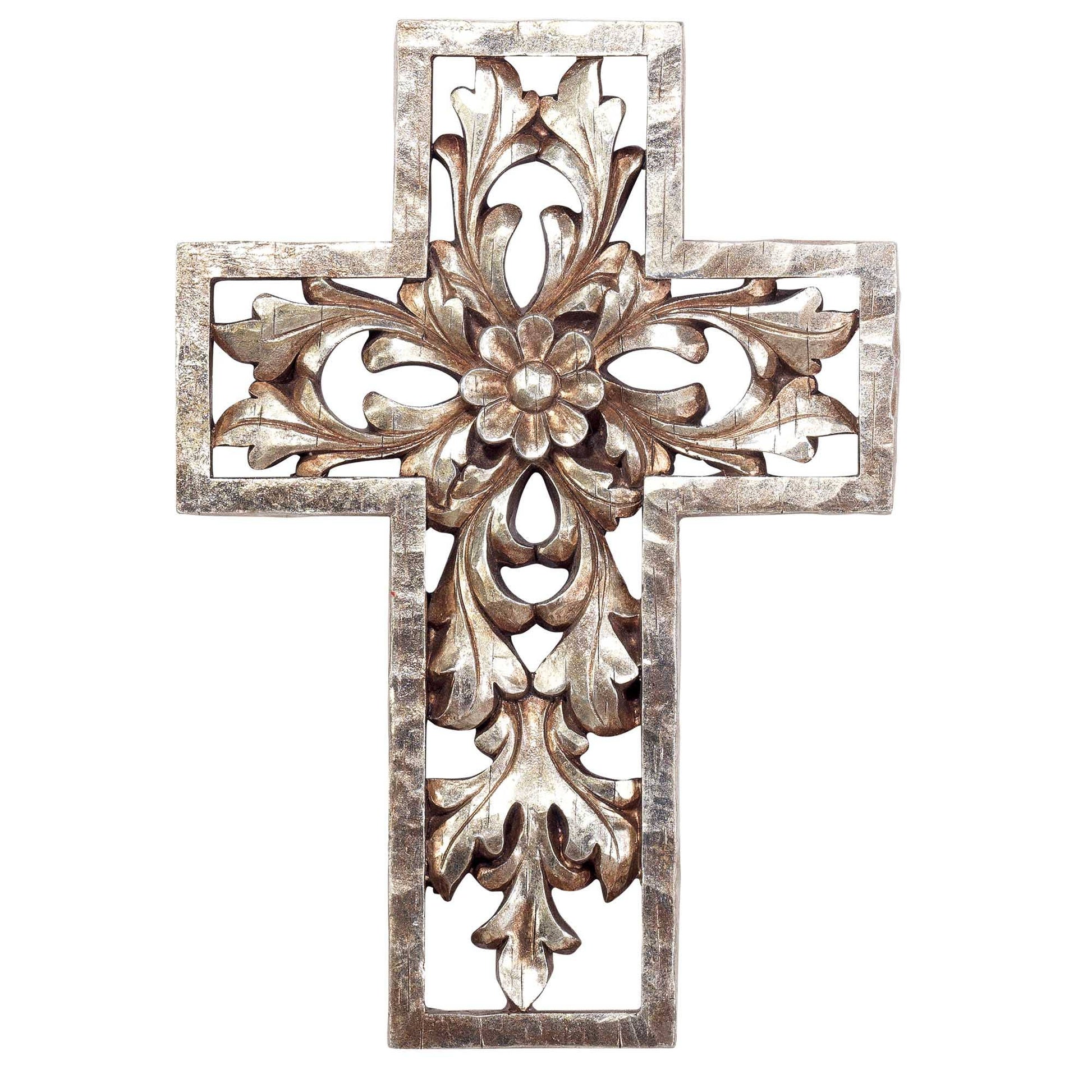 Gorgeous wall cross has open dimensional design in a box style rim. The design alone is beautiful, and the finish makes it extra special with its well placed tinges of white, brown, bronze and gold. Made of resin, it has a height of 11 1/2".
