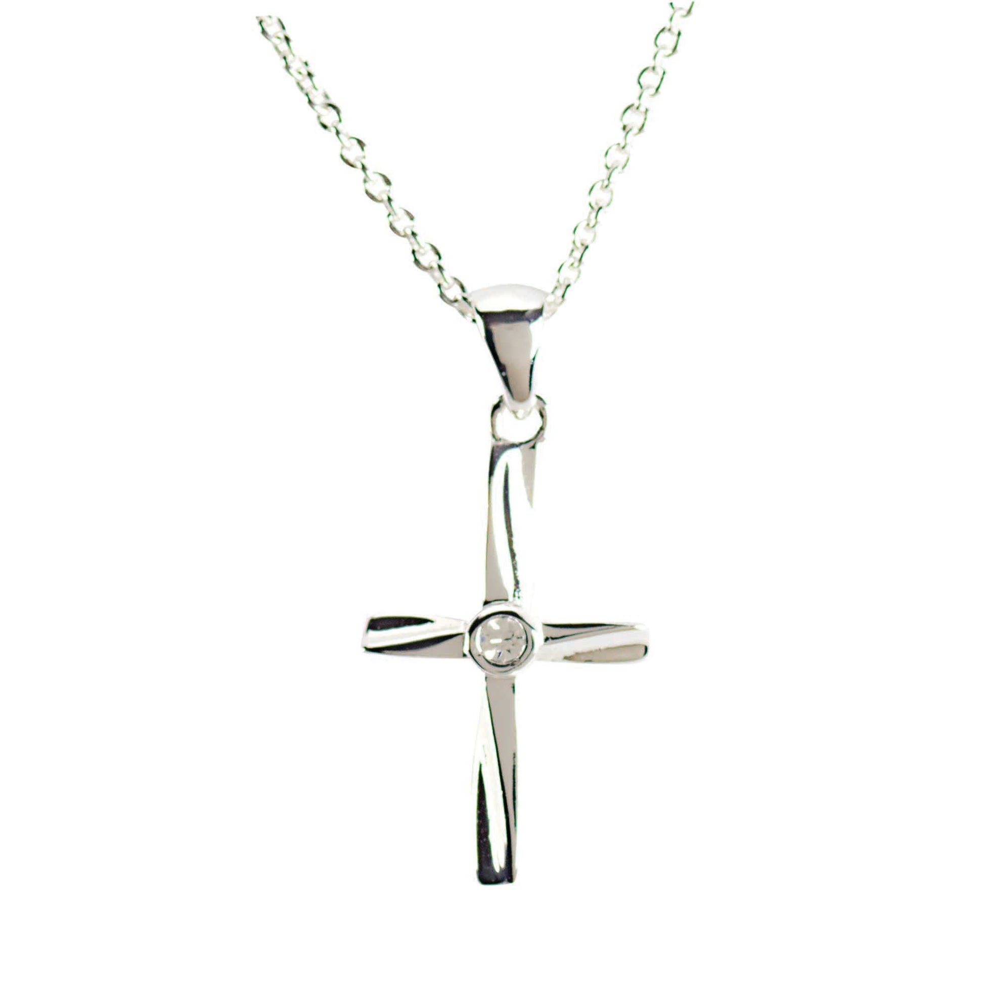 Silver Plated 3/4-inch ribbon cross has a crystal center and hangs from an 18-inch chain. Packed in a white hinged gift box for the female graduate with a congratulatory insert and verse from Jeremiah 29:11-13.