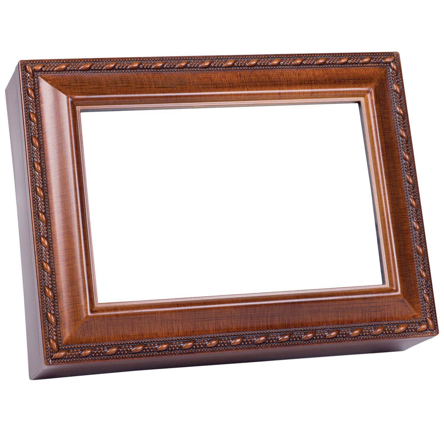 Woodgrain Finish Musical Keepsake Box with Photo Frame Lid by Cottage Garden Plays "You Light Up My Life" This handsome keepsake box features a woodgrain tone finish and rope-style beaded rim. The hinged lid is also a photo frame with glass. Just change out the insert for a favorite 6" x 4" photo; the removable back under lid makes it easy. Inside box is a small compartment with clear glass top that shows the high-quality Sankyo musical movement. When key under box is wound, music will play when lid is open and stop when it is closed. Plays the song "Amazing Grace." Storage compartment has a luxurious black velvety lining. Decorative silver tone legs on bottom are padded to protect furniture. Box is made of a super-sturdy polymer that resists cracking and chipping. Overall size is 8" x 6" x 2 5/8".