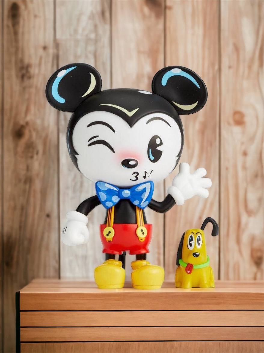 Your favorite mouse is reimagined with a spotted blue bowtie, striped suspenders and floating music note by his cheek as he whistles a tune next to an endearing mini Pluto.