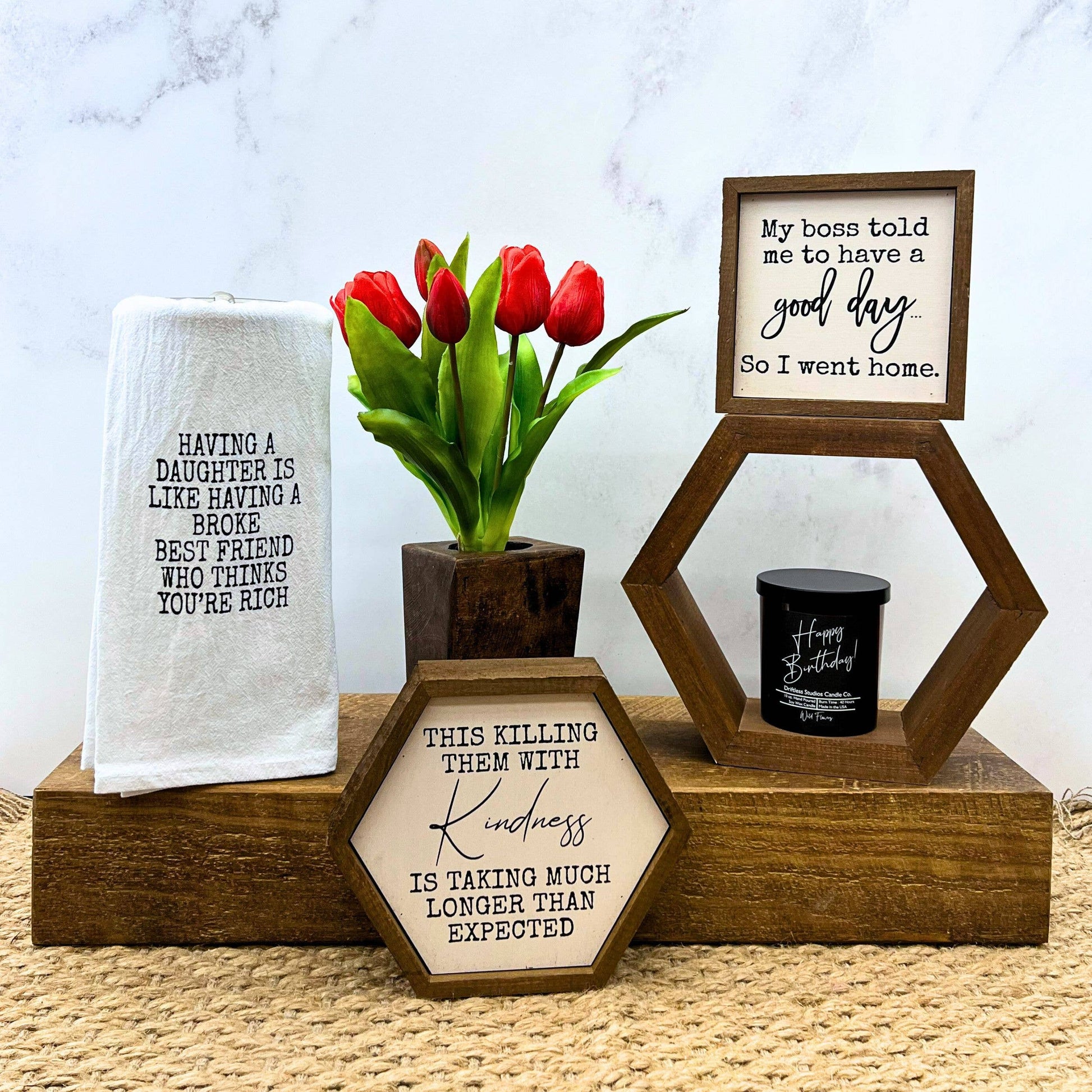 These Hexagon signs are a different take on wall/shelf décor. We strive to mix the perfect blend of rustic and modern styles that will last for years. All of our signs can be easily hung directly off of the frame or will stand upright on shelves or desks.