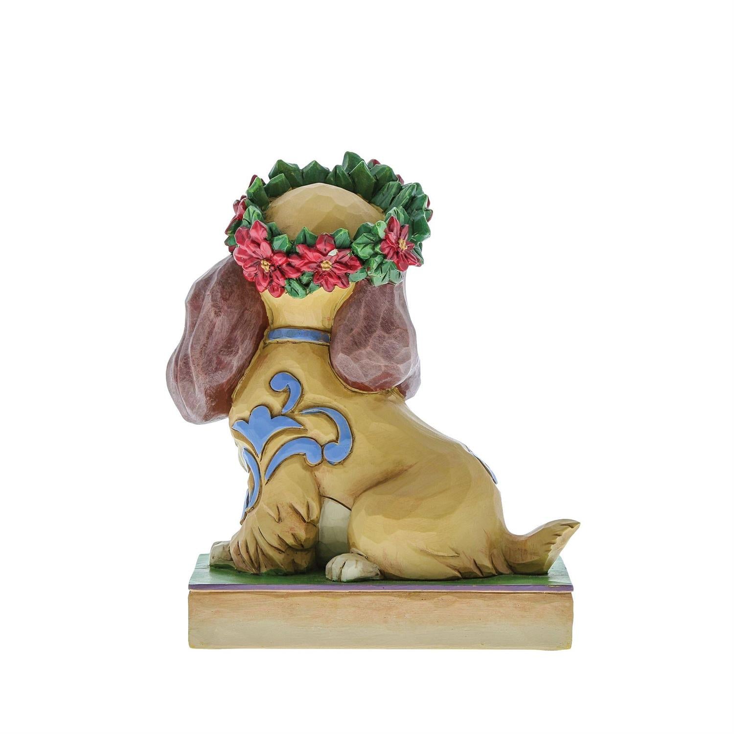Lady, the regal Cocker Spaniel, wears a crown of holly in this lovely relief by Jim Shore. Her classic blue collar is matched by gorgeous rosemaling running down her coat.