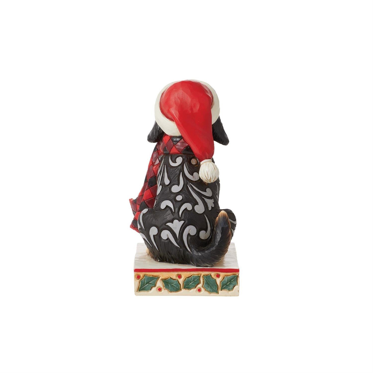 Wearing a Santa hat and buffalo plaid scarf, this Highland Glen cheerful pup is a wintertime delight with a bark! Tongue out with a sweet disposition, this holiday hound wears a jingle bell and boasts a lovely rosemaling coat. The snow dog sits on as sta