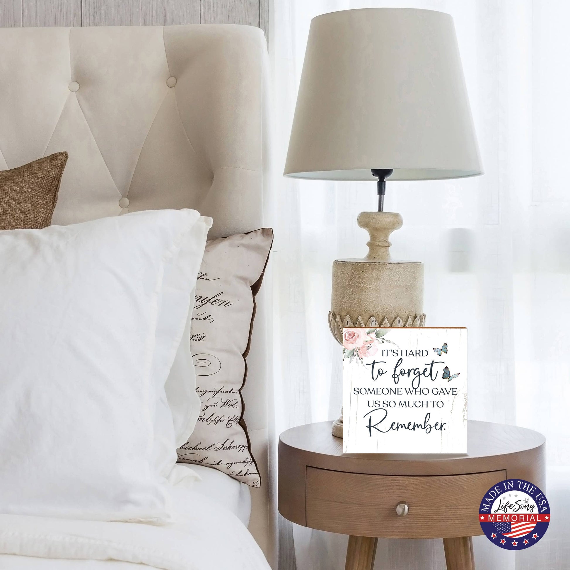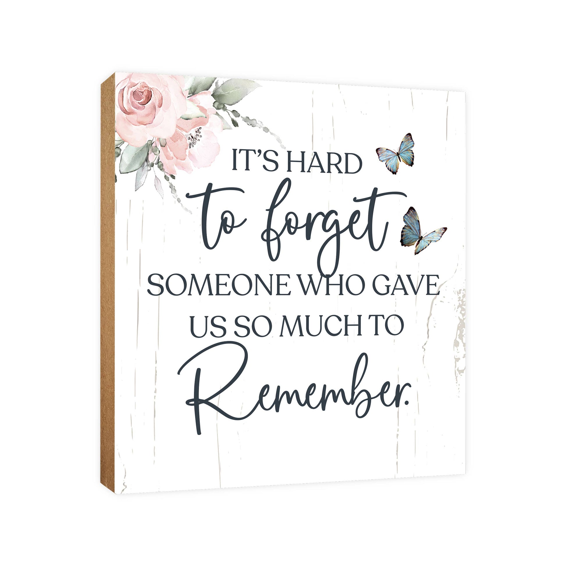 This handcrafted Memorial Shelf Sitter, created from durable MDF in the USA, beautifully expresses your heartfelt sentiments. Featuring the touching verse, "It's Hard to Forget Someone Who Gave Us So Much to Remember," this piece is adorned with flowers and butterflies, adding a touch of grace and comfort. Perfect for offering sympathy and remembrance, it serves as a comforting tribute during times of bereavement. Ideal for those seeking a meaningful way to honor a loved one, this shelf sitter is a touching addition to any memorial or condolence setting. A cherished keepsake that shows both love and memory, it provides warmth and beauty in loving memory.