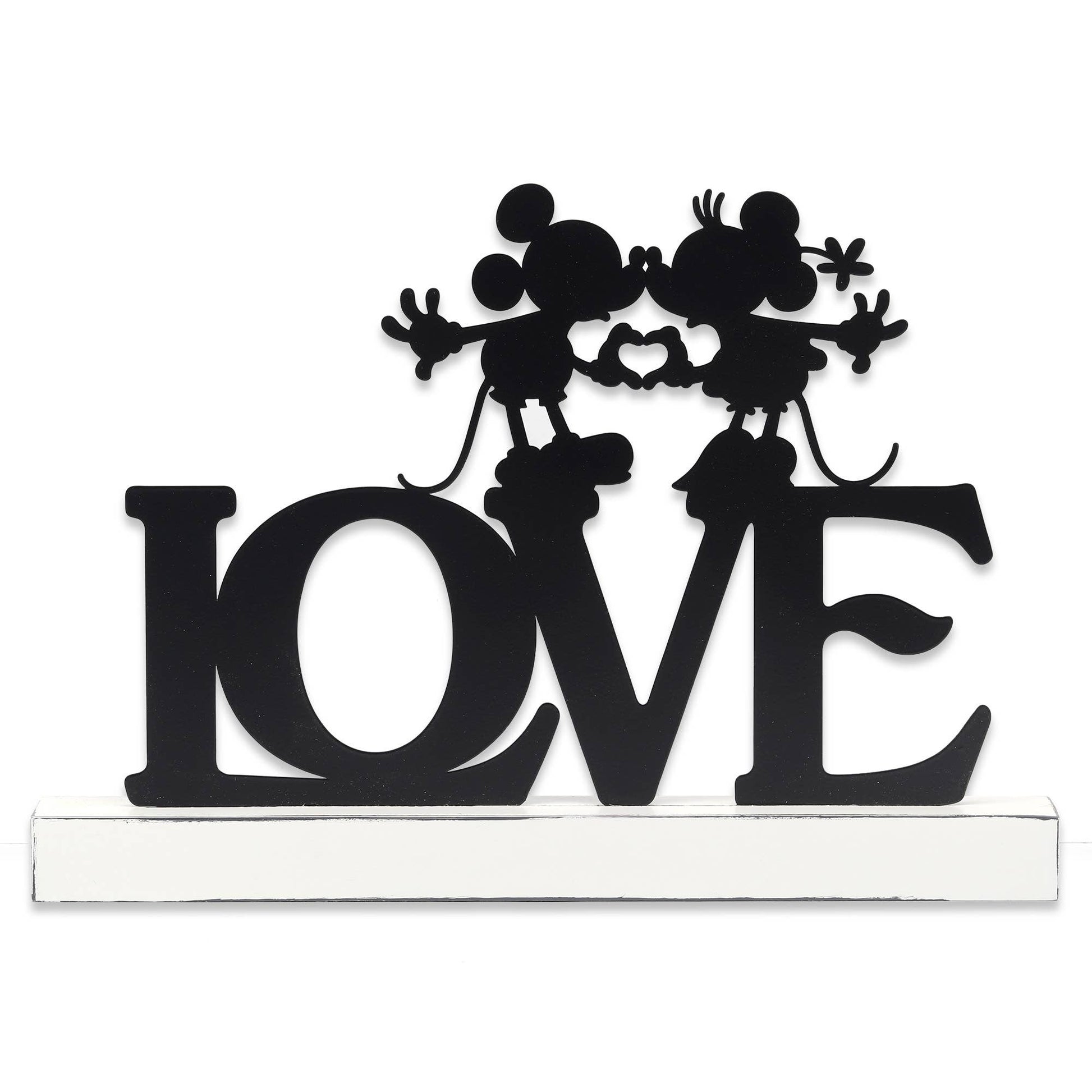 Disney official product: Dreams come true - just ask Mickey and Minnie! The two beloved cartoon mice are depicted in silhouette form on this whimsical decor, which features the pair smooching atop the word "Love." Fun Tabletop Decor: In a classic black and white color palette, this decor delivers Disney magic in a neutral, easy-to-coordinate way. Material: This die-cut decor is made of metal with a durable, yet lightweight MDF base for easy display. Places to Use: Hang this playful decor or display on any flat surface in your bedroom, play room, or movie room. Size: 12" W X 8" H X 1.5" D