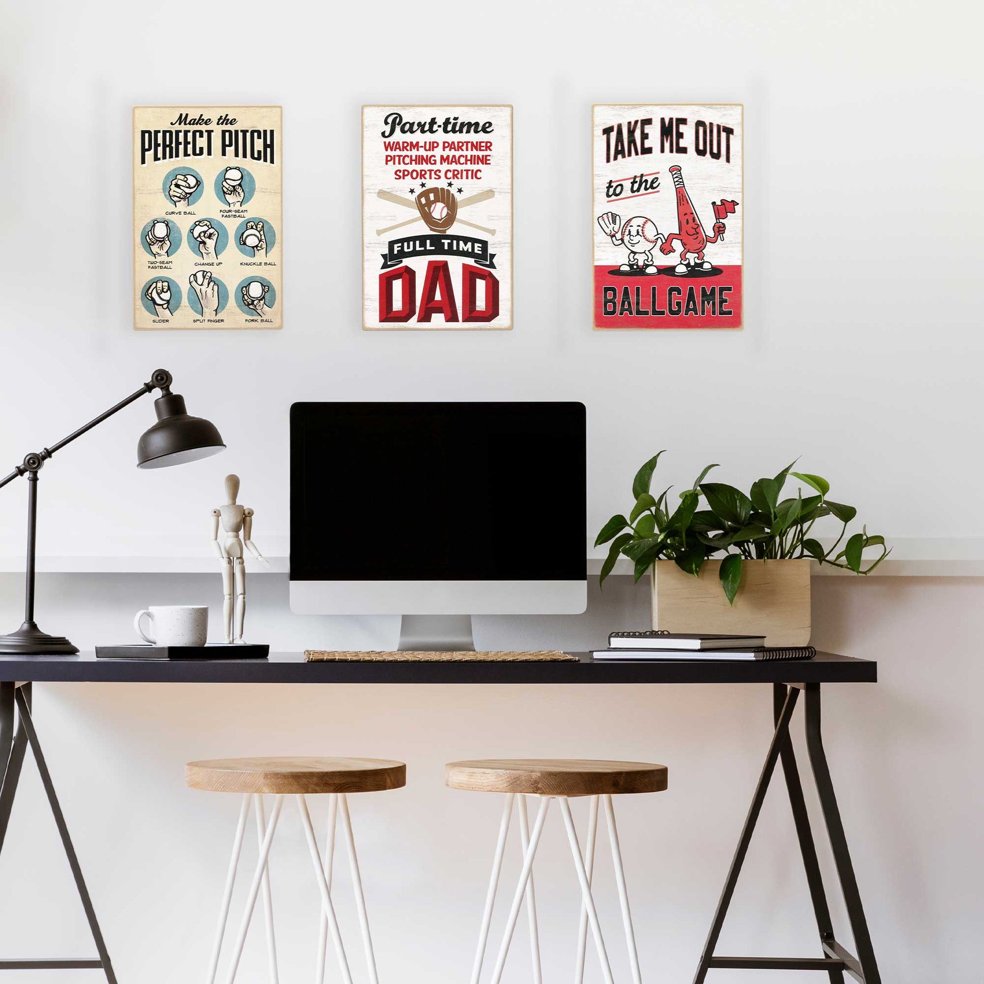 You can almost taste the peanuts and Cracker Jacks when you see this charming, retro wall art! In patriotic red, white, and blue hues, this fun decor is a must-have addition to your baseball decor collection. Fun Vintage Sign: Featuring a smiling baseball and bat, this vintage wall art is as exciting as cheering your favorite ball team to victory! Material: This statement-making decor is made of durable, yet lightweight MDF wood. It includes a keyhole slot for quick and easy wall display. Made in the USA. Make a sporty addition to your man cave, kids' room, or play room with this charming sign. Size: 7.5" W X 11.25" H X 0.25" D