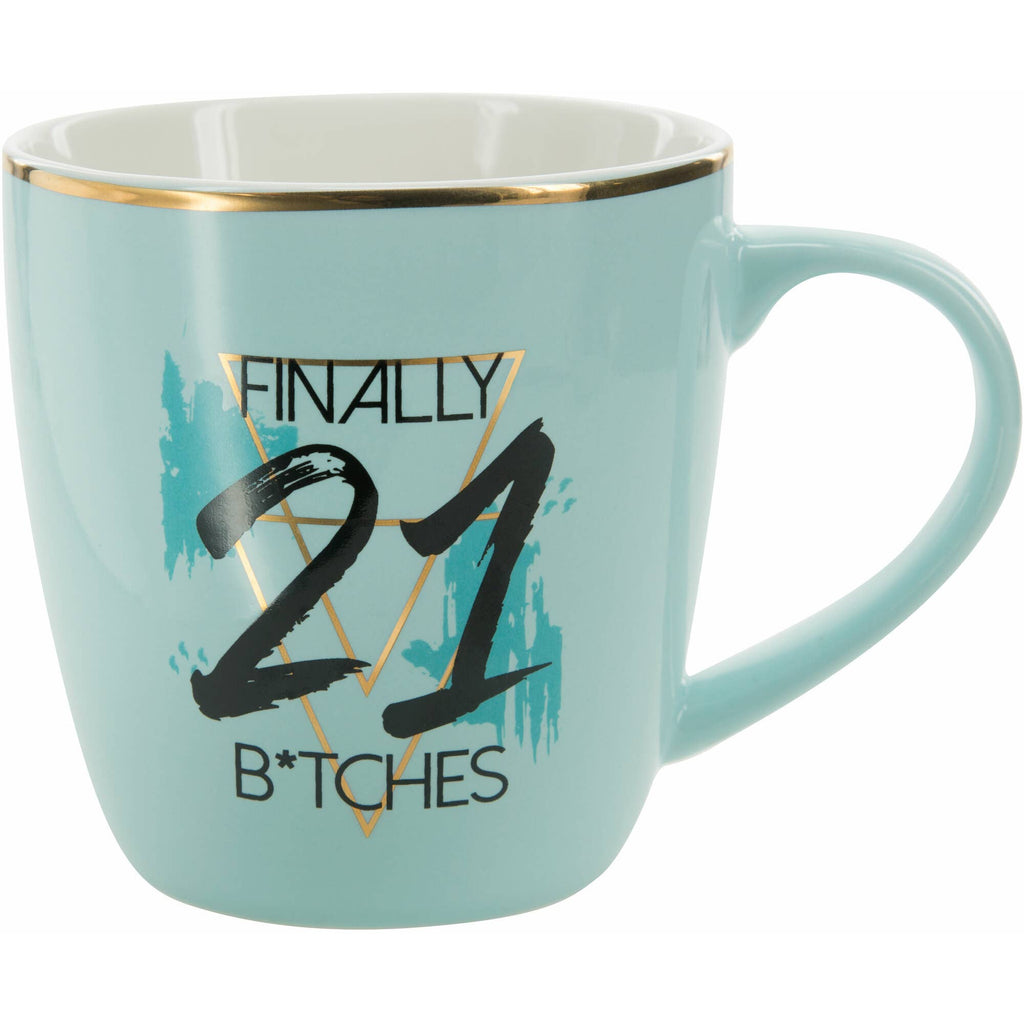 17oz mug, packaged in a plain box, is made from Prop 65-approved new bone china. "Finally 21 B*tches" text and accompanying decal are both printed onto the mug. Dishwasher safe, although washing by hand is recommended to best preserve decals. Do not microwave. Great for gifting to a friend who is celebrating their 21st birthday.