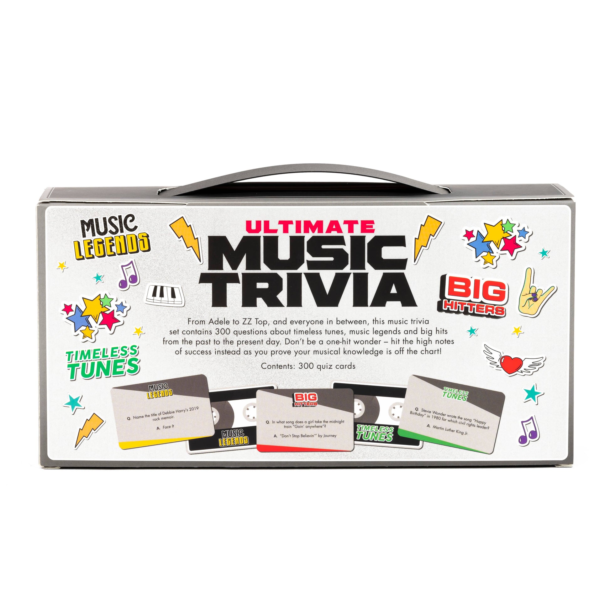 From Adele to ZZ Top, and everyone in between, this music trivia set contains 300 questions about timeless tunes, music legends and chart-toppers from the past to the present day.