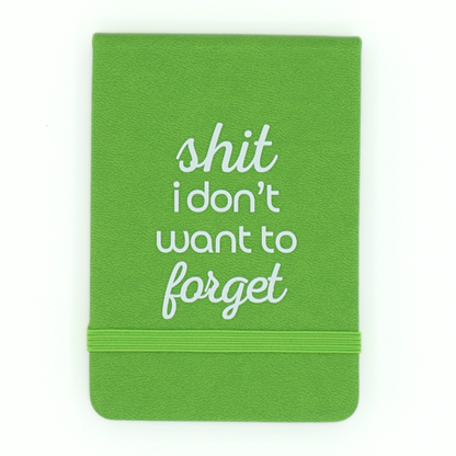 Fill this with things that, well, you don't want to forget. Me personally, mine is absolutely full. Back by popular demand and with an updated design. The cover is made of a soft leatherette material, and the print is embossed. It reads “Shit I Don't Want to Forget” in white writing on a green background. Half the pages are lined, and half are unlined. It has an elastic band attached to keep the notebook closed. The perfect pad to keep all your notes and ideas jotted down. Cover measures approximately 3" x 4.25"