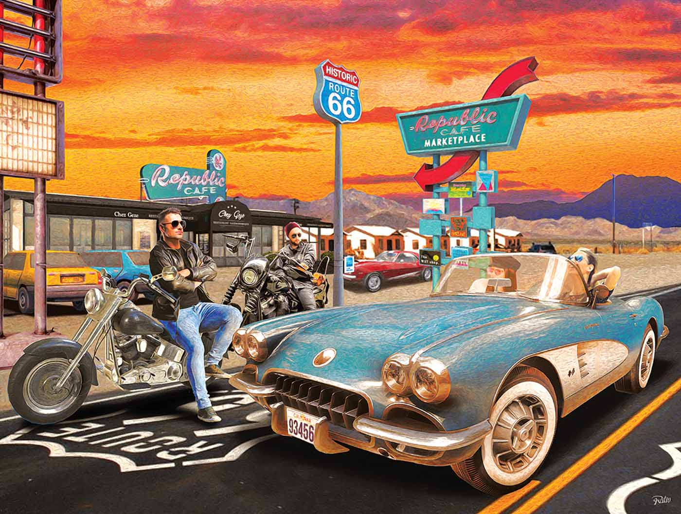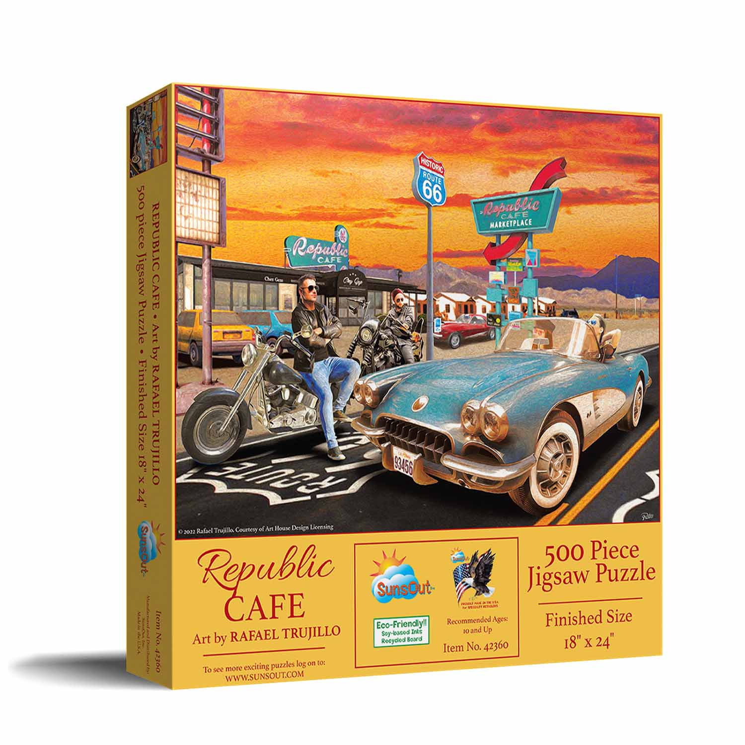 Get ready to step back in time with the Republic Cafe jigsaw puzzle by SunsOut. Designed by the talented artist Rafael Trujillo, this 500-piece puzzle captures the essence of nostalgia and retro vibes. With its dimensions of 18" x 24", it's the perfect size for a challenging yet rewarding puzzle-solving experience. Whether you're an avid puzzle enthusiast or a casual puzzler, this jigsaw puzzle is suitable for anyone aged 11 and above. Take a break from the digital world and immerse yourself in the joy of piecing together this nostalgic scene. Let the Republic Cafe puzzle transport you to a bygone era where life was simpler, and memories were made.