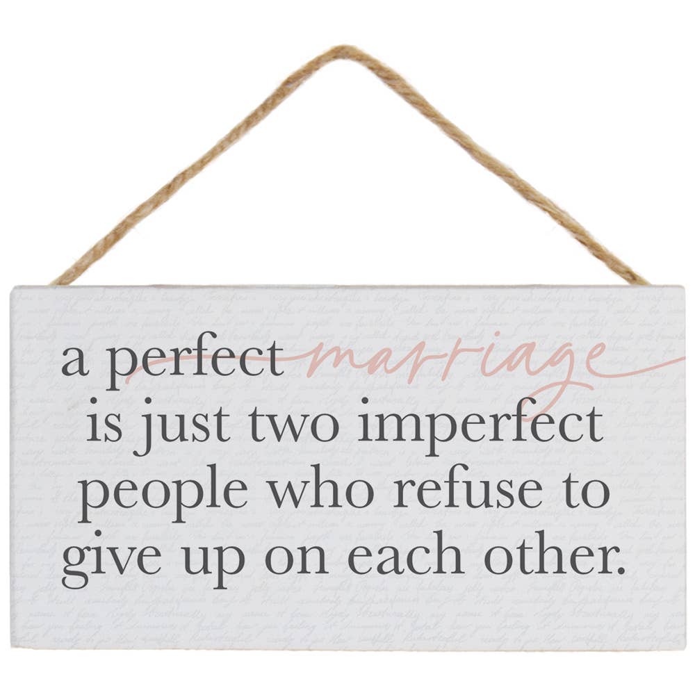 A perfect marriage is just two imperfect people who refuse to give up on each other. Each sign is made from real cedar wood which accents the wood’s natural grain. This means that each sign is one of a kind. Twine is securely stapled to back of wood for easy hanging. • Raw wood paired with simple sayings adds a personalized touch to every space. • Braided twine allows sign to be easily displayed in any space or to be hung as an ornament. • Wood sign measures 5.5” x 6.5” x .5” — a great size for decorating small nooks and crannies. • Proudly designed, printed and handcrafted in our small-town shop in Rock Rapids, IA — USA. • Top Selling Gift idea.