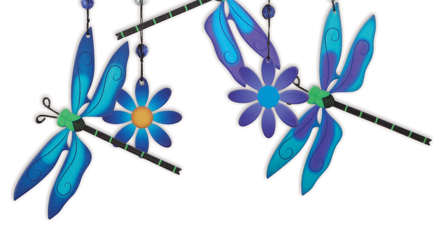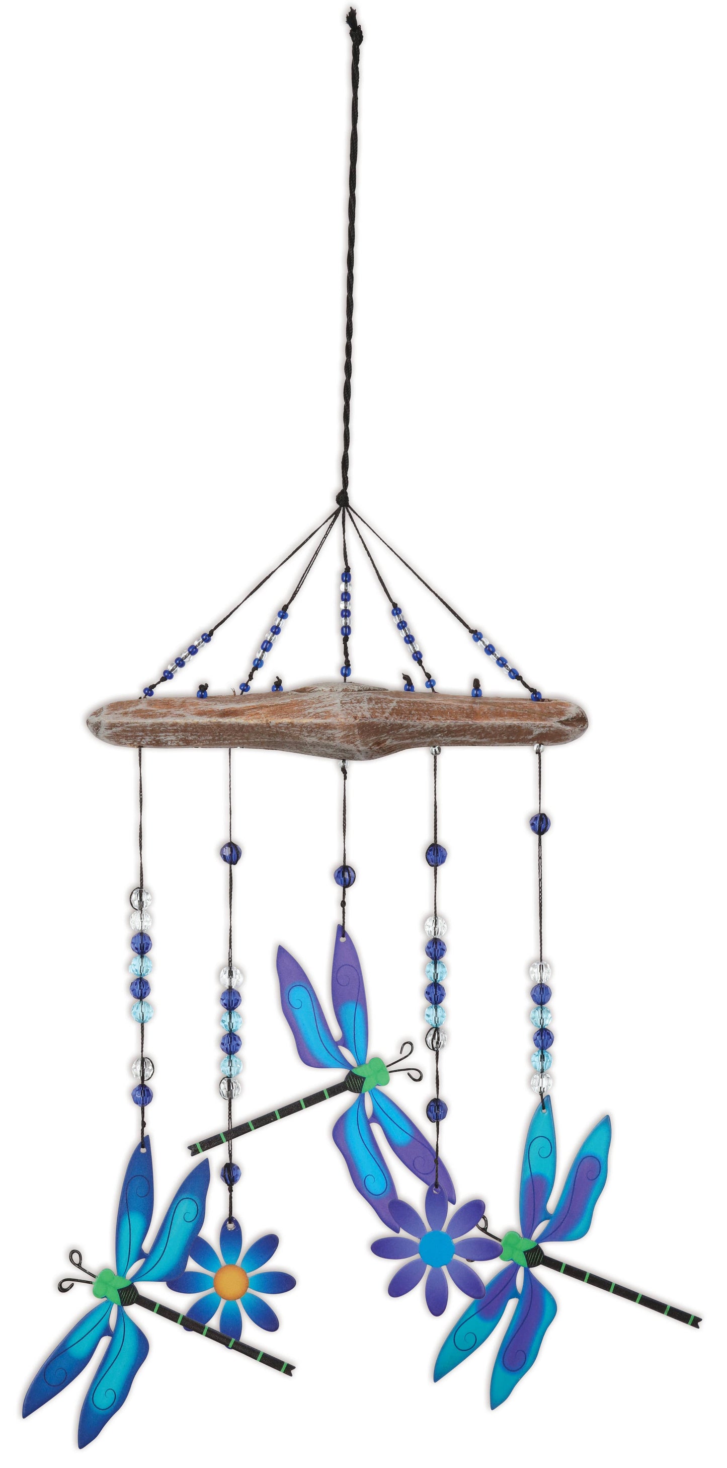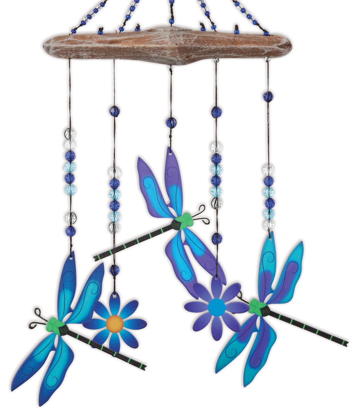 Painted Gardens Dragonfly Wimsey Chime Three beautiful dragonflies dance with Daisy petals as the wind blows. Balancing from the natural wood beam, each hand painted metal dragonfly and flowers dance in the breeze creating a gentle tone. Accented with colorful acrylic beads. Handcrafted & detailed. Accented with colorful beads. Includes easy hanging string. Measures approximately: 9.5" x 1" x 10"