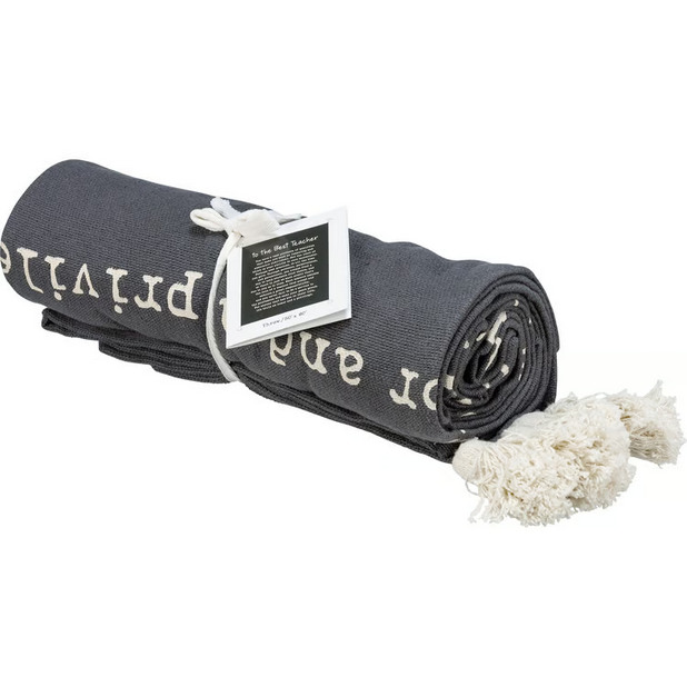 A soft cotton throw blanket displaying a heartwarming teacher-themed poem entitled "To The Best Teacher" in a neutral color palette. Throw blanket design features hand illustrated and typeset text with coordinating corner tassels for added interest. Our To The Best Teacher throw blanket is conveniently machine-washable for easy cleaning. Throw blanket measures 50 inches by 60 inches for plenty of cozy coverage and comes rolled, tied with cotton tape, and a hang tag displaying full blanket design. An inspirational teacher-themed gift perfect for an everyday home accent in any room.