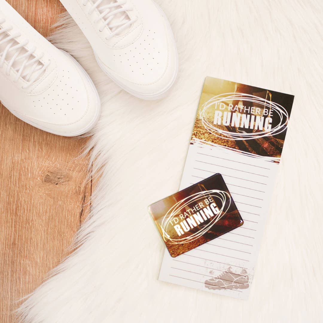 Wouldn't you rather be Running? The perfect pick-up including a 4" x 9.25" magnetic list pad and a matching 2.5" x 3.5" fridge magnet. Each notepad contains 60 easy tear sheets and a magnetic backer. Notepad is designed and printed in the USA. Our super-strong magnets feature vibrant full-color artwork under a domed epoxy finish.