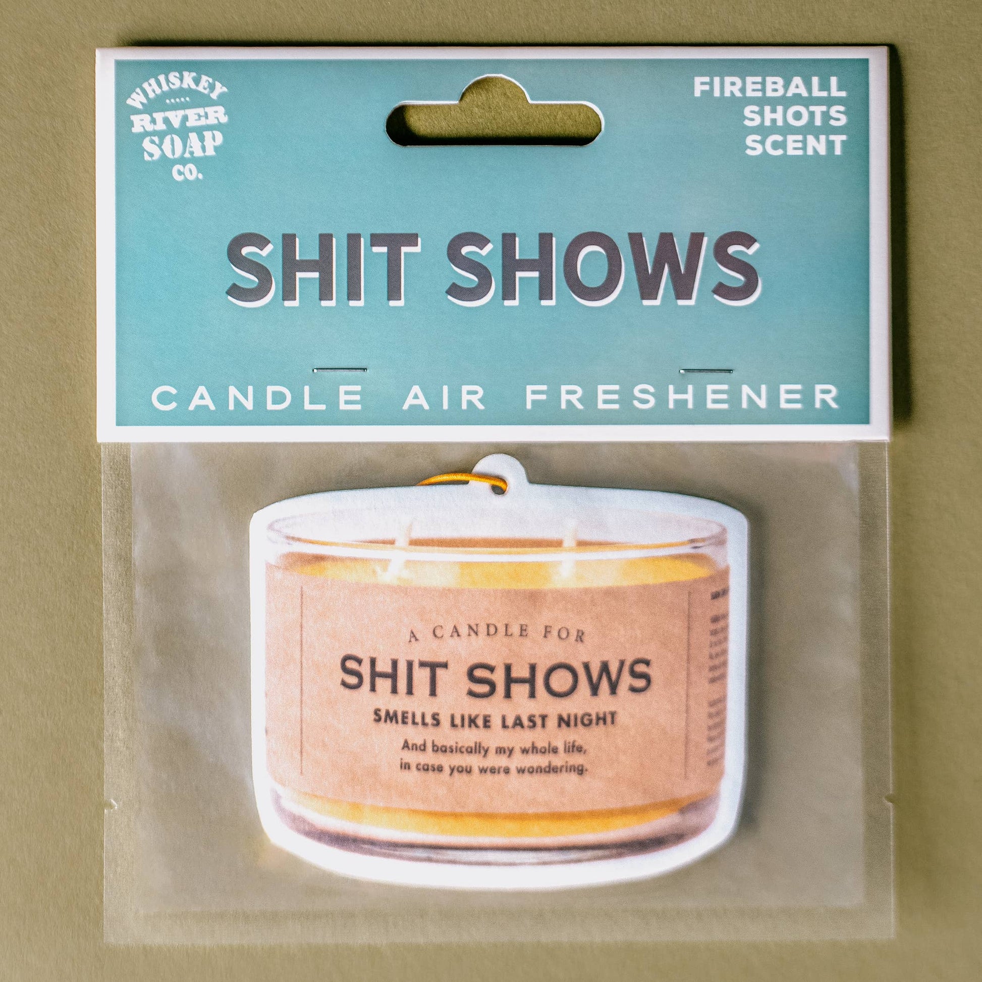 Know what stinks? Not you! Now that you have your very own candle air freshener to haul around with you, people will quit pinching their noses and running for the hills. Hopefully. You still have to occasionally bathe, you know. Fireball Shots Scented Double-sided full-color air freshener measures 3 1/2″ x 3″ H; comes with nylon hanging cord © 2021 Whiskey River Soap Co. Air freshener size: 3 1/2″ x 3″ H Package size: 5 ½" W x 6 ½" H Double-sided, full-color.